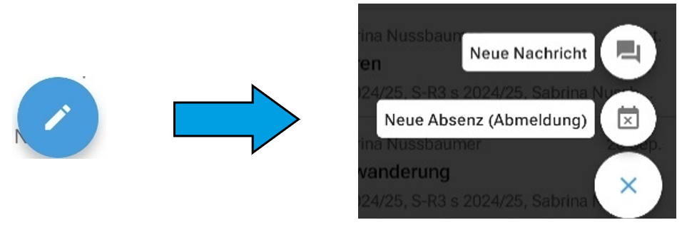 Sie melden Ihr Kind täglich ab. Klicken Sie dazu im Menu Nachrichten auf das blaue Stift-Icon Anschliessend wählen Sie „Neue Absenz“ aus. Wenn Sie mehrere Kinder erfasst haben, müssen Sie noch das betroffene Kind auswählen.